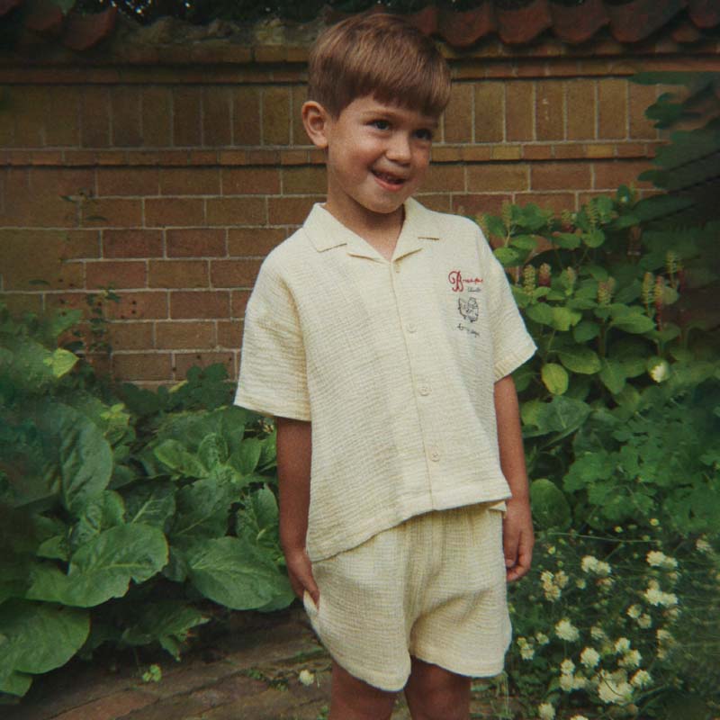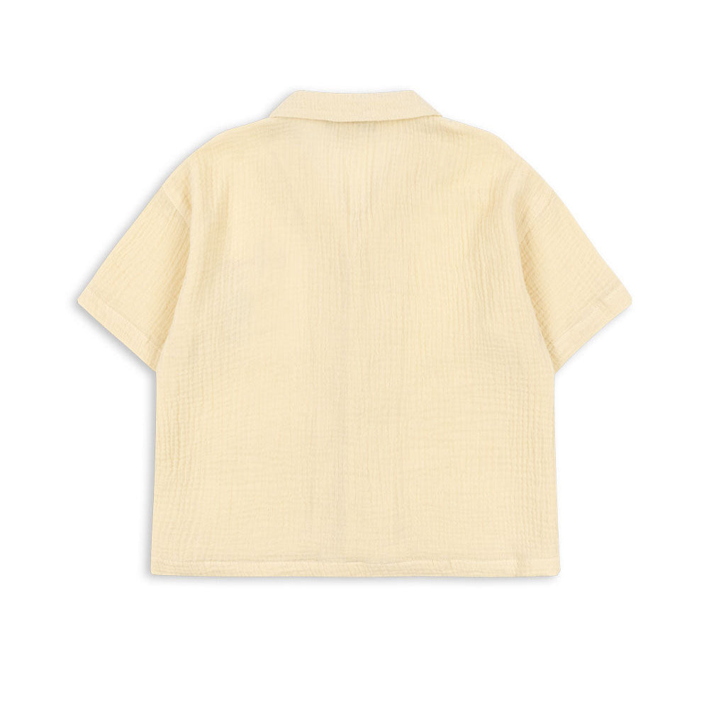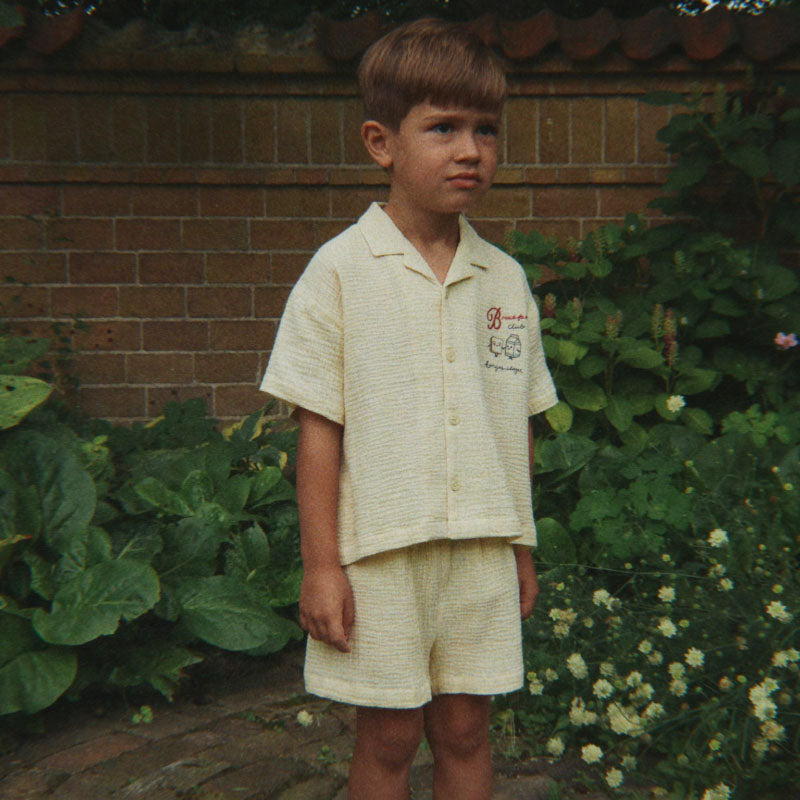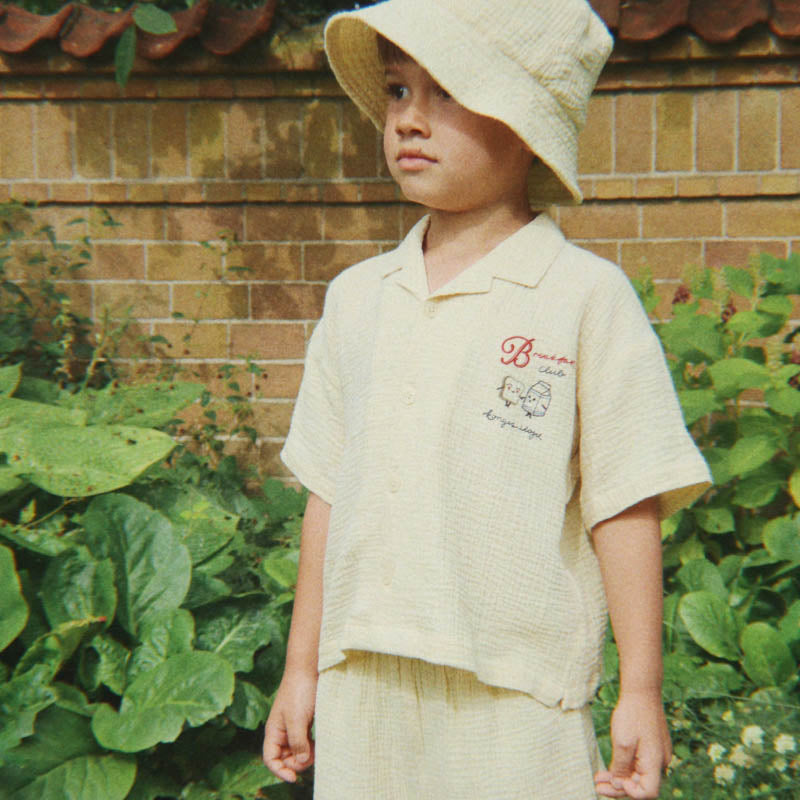 Lovely Konges Sløjd soft summer shirt in organic cotton muslin with super-sweet 'Breakfast Club' smiley toast and milk carton embroidery on the chest. It has a straight fit, buttons to the front and flat collar.