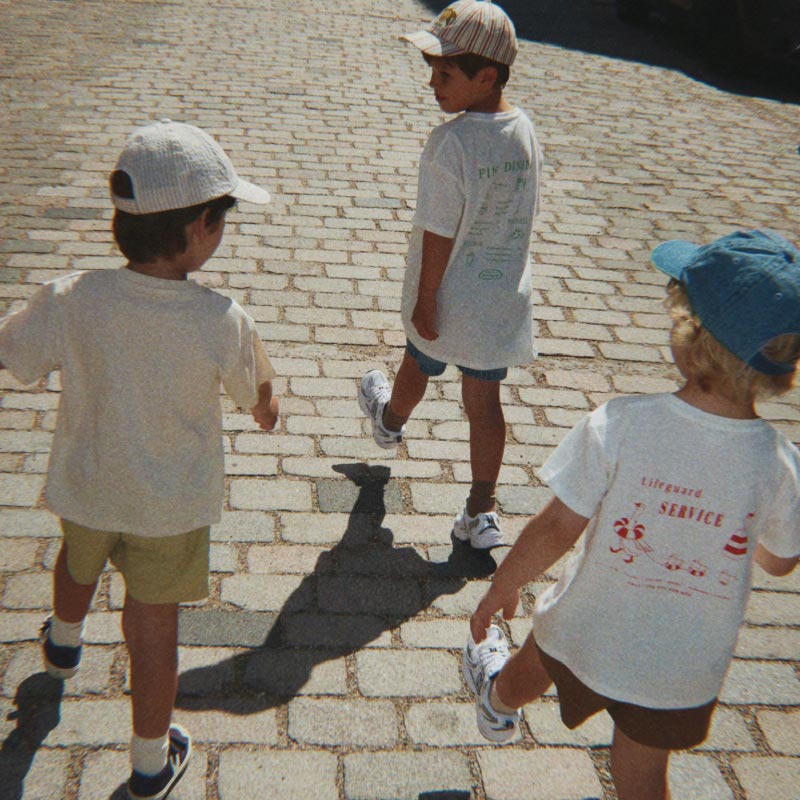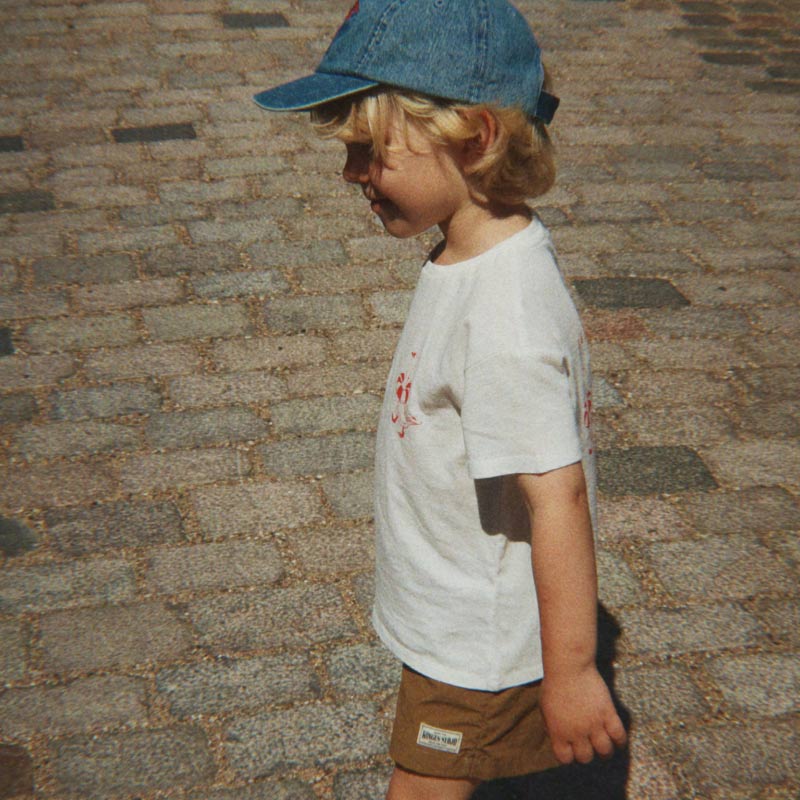 Konges Sløjd's Era tees are soft summer essentials, made from a breathable linen/organic cotton blend with a refined texture. This great short-sleeved T-shirt has a chest print with a duck and a swim ring, and on the back 'Lifeguard Service: free swim lessons provided' with a duck family.