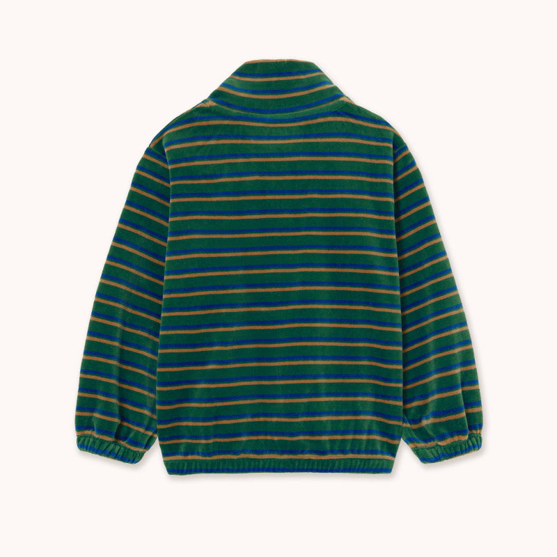 Stripes forever! Tiny Cottons dark green striped sweatshirt made from organic cotton velour. It has a mockneck, elasticated hems and a half front button opening.