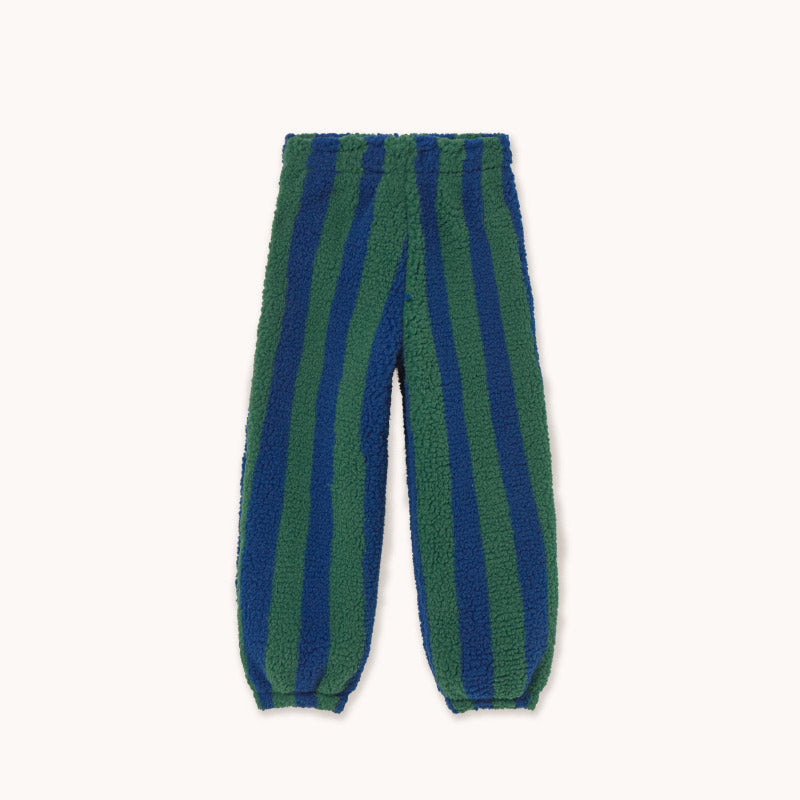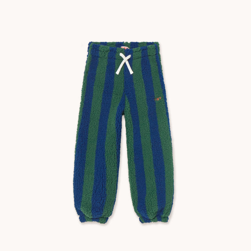 So-good Tiny Cottons sherpa sweatpants in green and navy stripes. These cosy trousers have a relaxed silhouette with a comfy, elasticated drawstring waistband and elasticated hems.