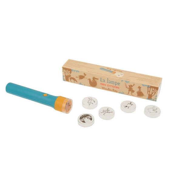 Add a twist to bedtime stories with Moulin Roty's shadow torch: place one of the six picture discs onto the torch and project shadows onto the wall or ceiling. There's a princess, witch, dragon, forest, wolf and a knight. Perfect for sparking imagination: adults or kids can weave them into stories!