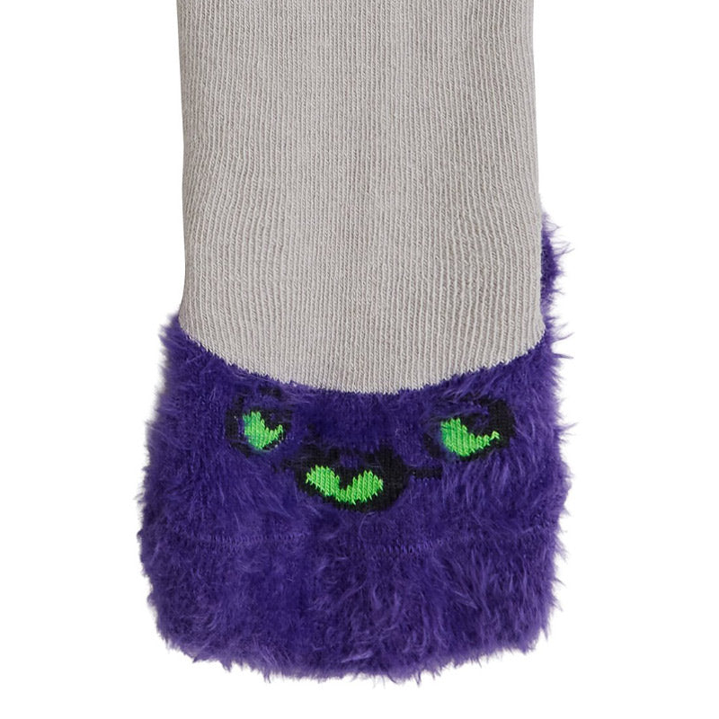 Super-fun Mini Rodini baby tights in grey organic cotton-mix. They have 'The Intergalactic Travel Agency' on the bottom, stars on the knees and purple furry alien feet.