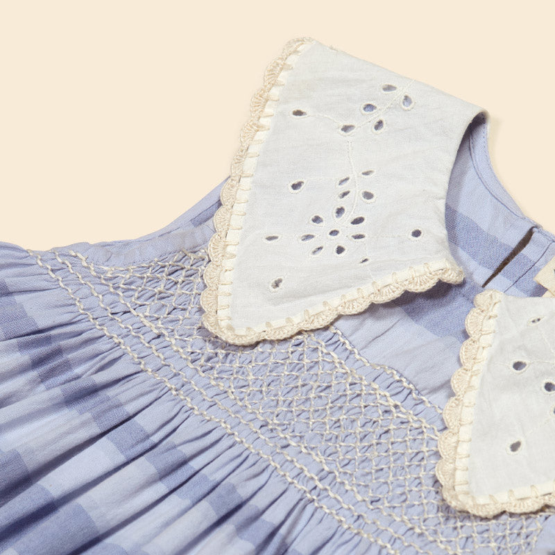 The beautiful Apolina Cornelia smock dress is crafted from ‘Summerhouse Stripe’ cotton, with hand smocking at chest. It features a gorgeous, oversized statement collar in broderie anglaise with scallop crochet trim. There is keyhole fastening at back.