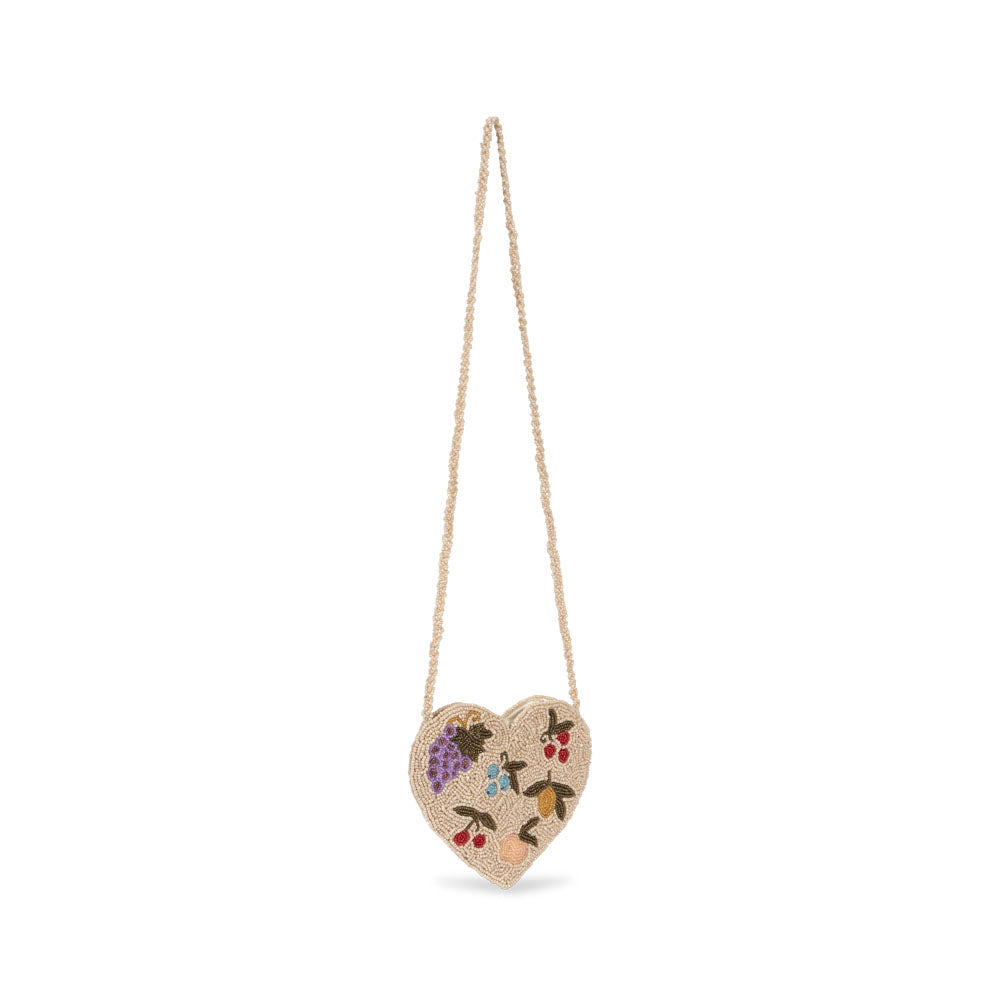 Gorgeous Konges Sløjd cream heart-shaped beaded bag with fruits design – cherries, lemons, grapes and more. Intricately beaded by hand, this is a gorgeous, special accessory.