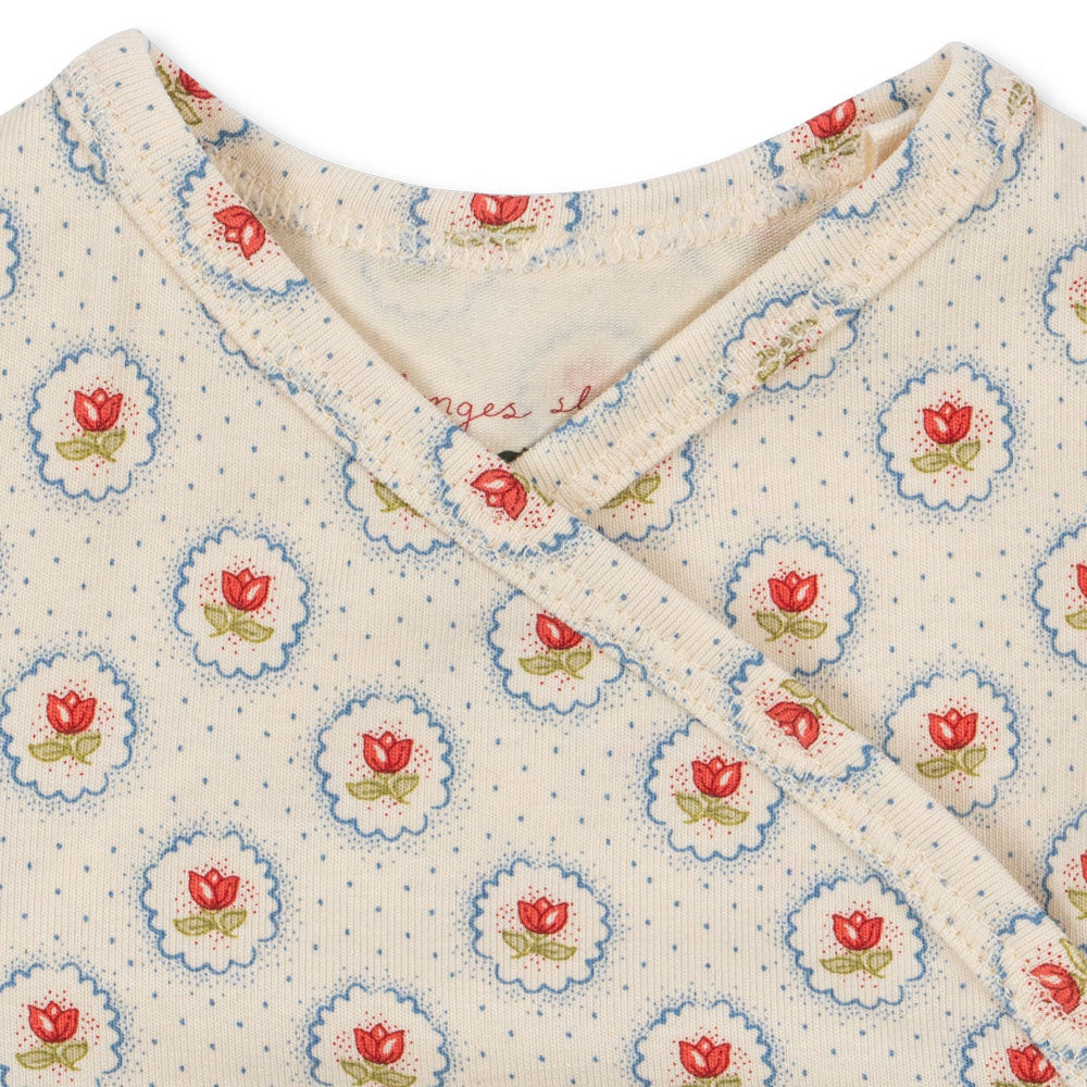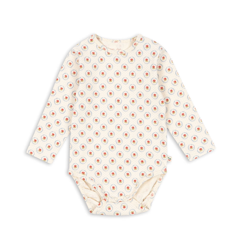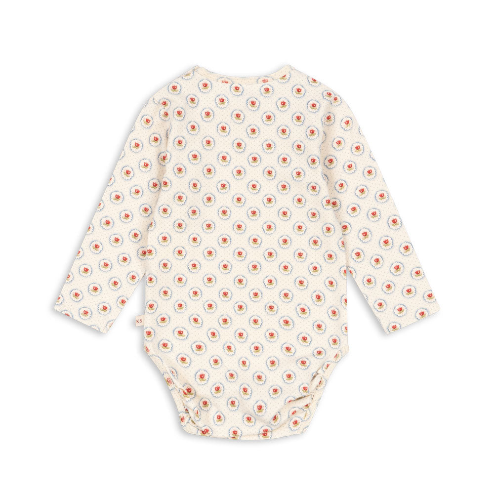 Lovely Konges Sløjd long-sleeved baby bodysuit in delicate Mirage floral print. Made from soft organic cotton with hint of stretch, it has press buttons at at the crotch. The smaller sizes (3 months and 6 months) have a wrap front for easy dressing.