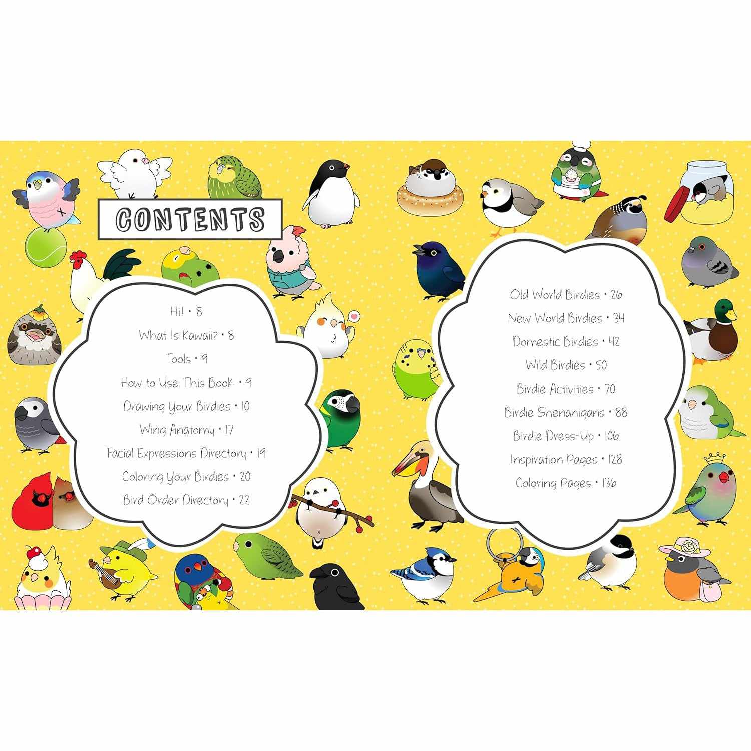 In the Bird Order Directory, learn the order in which each species included in the book belongs in. Fun chapters include: Birdie Activities, Birdie Shenanigans, and Birdie Dress-Up. Learn to draw the cutest birds doing all types of silly activities, including: cuddling, stealing, peekabooing, pouting, camping, baking, surfing and battling.