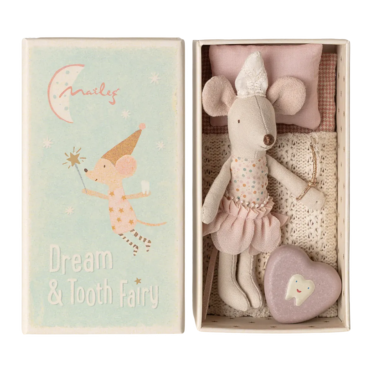 This darling Maileg little sister mouse soft toy is the tooth fairy! She has a sweet tutu, hat and wand. Kids can pop their tooth into the sweet metal box. Tuck her up in her matchbox and bedding after a busy night collecting teeth!
