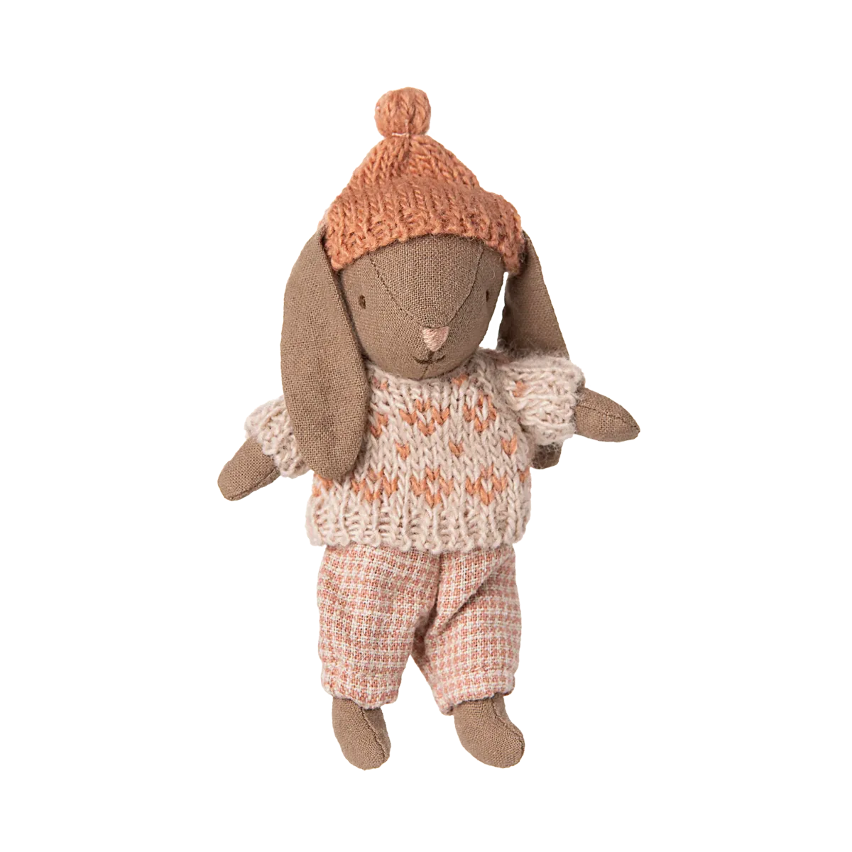Irresistible Maileg winter bunny rabbit soft toy. This brown micro bunny is wearing a cosy knitted pink jumper and trousers with a woolly bobble hat.
