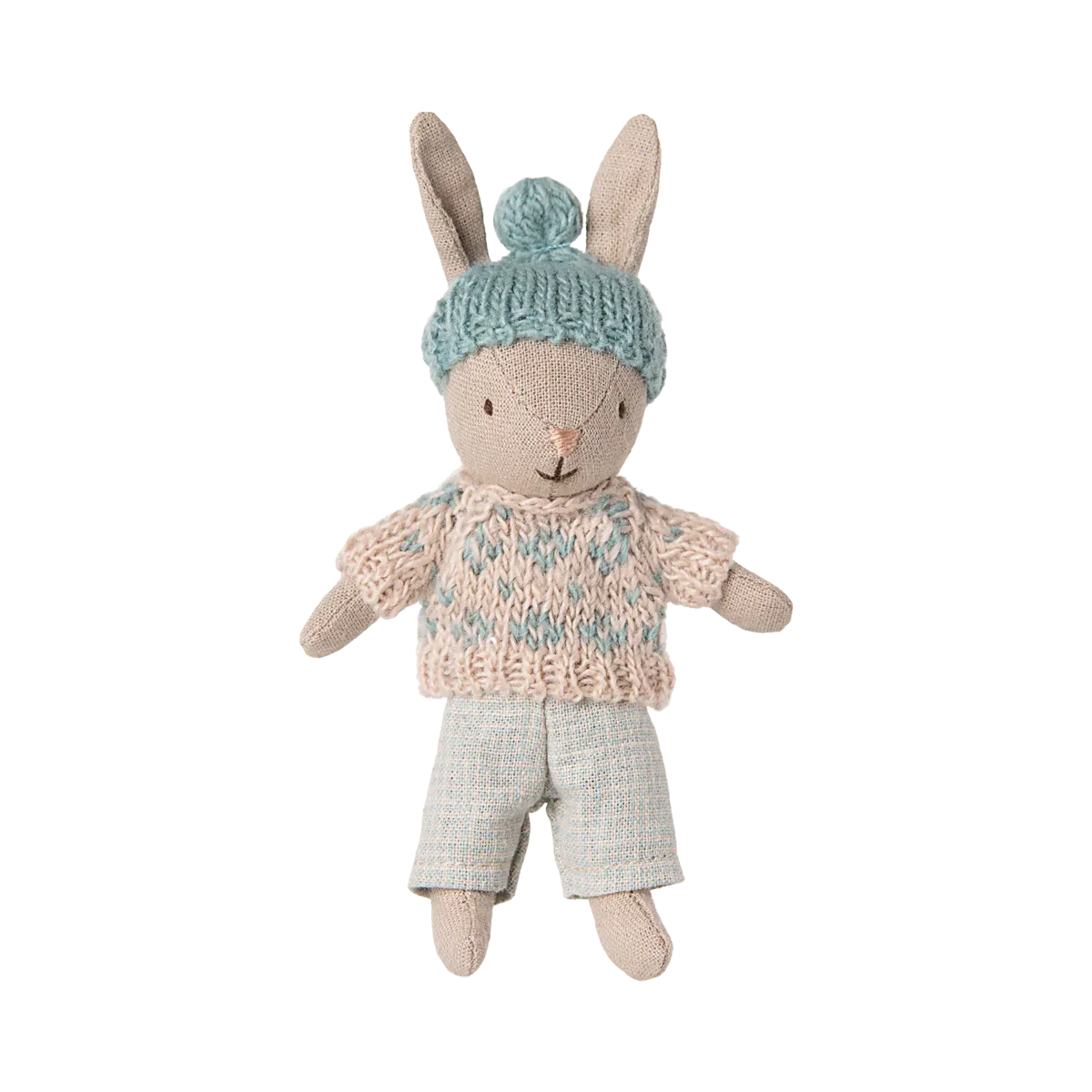 Irresistible Maileg winter rabbit soft toy. This micro rabbit is wearing a cosy knitted jumper and trousers with a woolly bobble hat.