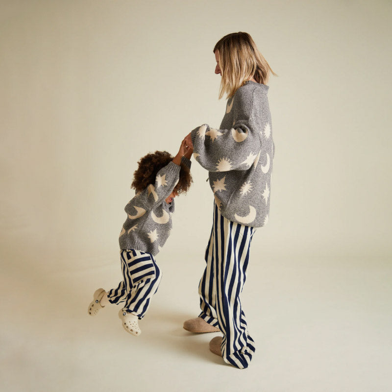 Gorgeous Claude & Co women's Midnight Moon jumper with moons, stars and suns pattern. Knitted in midnight navy organic cotton with Claude & Co's signature twisted yarn technique, this is a premium unisex sweater with an oversized, slouchy fit and exposed Claude & Co label on the side seam.