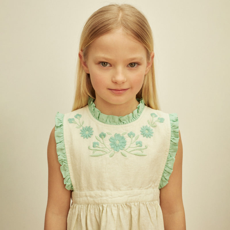 Apolina's beloved Ida dress returns in a ‘Mint Cream’ linen with motif embroidery and contrast ruffle trims to neckline, bodice and pocket in the season’s key highlight tone ‘Seaglass’. It features a sweet patch pocket for summer treasures. There is invisible zip closure at back. It's the perfect dress for holidays and parties. We love Ida worn alone or over a T-shirt.
