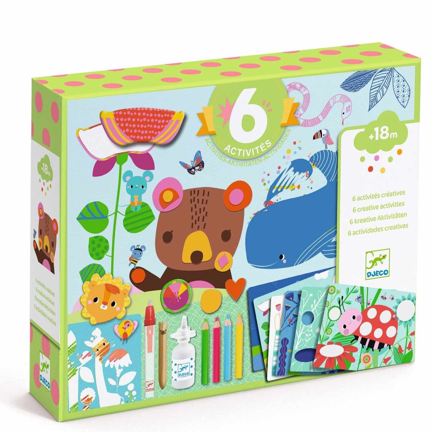 Collage: 1 illustrated card, 1 pre-cut board made of thick card and 1 tube of glue. Felt collage: 1 boards to be decorated and 4 sheets of self-adhesive felt pieces. Color Stop: 4 illustrated sheets, 1 stencil and 4 coloured pencils. Water colouring: 1 card with a layer of white and 1 water-filled pencil. Colouring reveal: 3 cards to be coloured, with a magic coating. Scratch card: 3 cards and 1 wooden tool. 1 step-by-step instruction booklet.