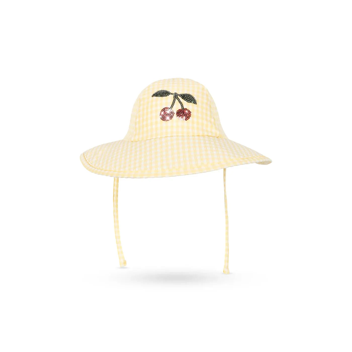 Sweet Konges Sløjd swim hat in textured yellow checked seersucker fabric with cherry sequin motif. It has a padded brim and ties to fasten under the chin. This lovely hat is made from a quick-drying, soft and stretchy fabric that protects against the sun’s UV rays with the highest ultraviolet protection factor, UPF 40+.