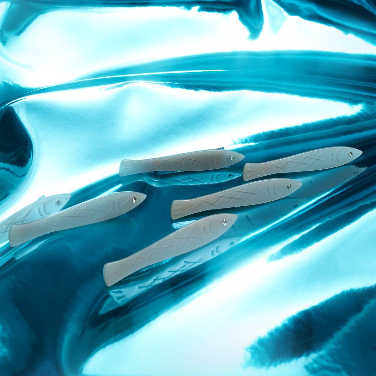 Delightful Winona Irene set of two silvery sardines hair clips. Made from cellulose acetate, they have delicate details with the perfect amount of sparkle, and silver-coloured alligator clip backing.