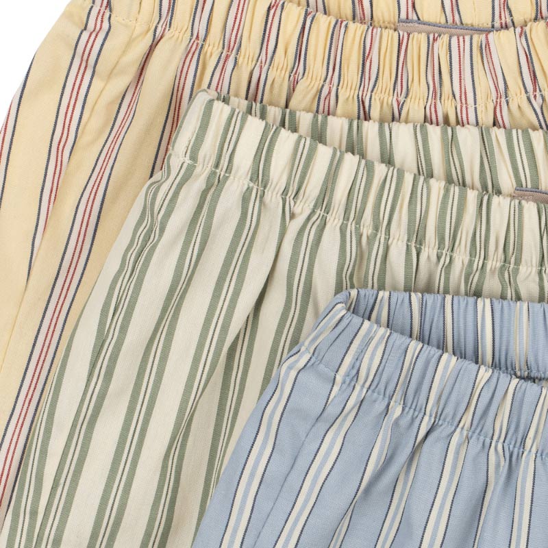 Konges Sløjd set of three pairs of soft shorts in breathable organic cotton that feels airy and light. These are instant summer wardrobe staples in three lovely striped colours (yellow, blue and green). Designed for a casual fit with an elasticated waistband and subtle side slits, these are great unisex shorts to mix and match with favourite tees and shirts.