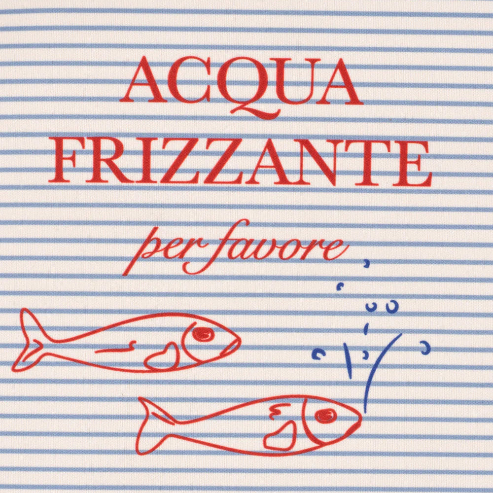 This is the 'Stripe Bluie' version with blue stripes and an 'Acqua Frizzante' print on the chest and back.
