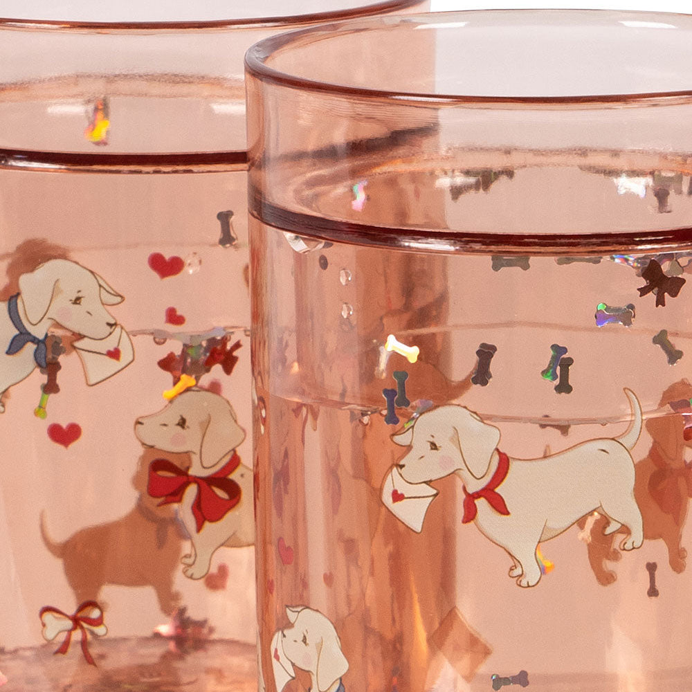 Spread some magic with this set of two Konges Sløjd rose pink glitter cups with cute dogs carrying letters. Shake lightly and the glitter will gently dance around.