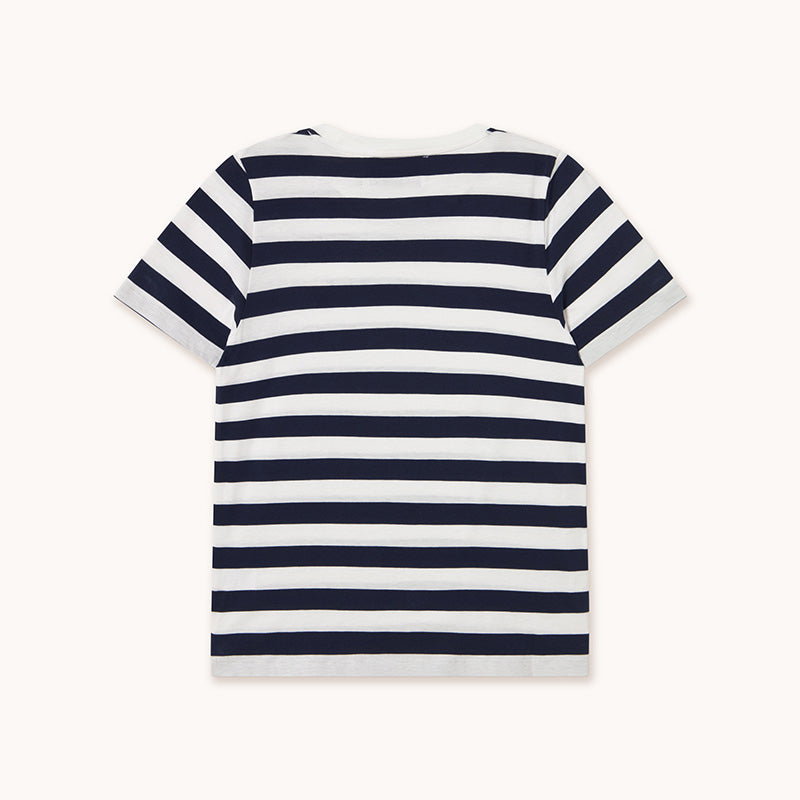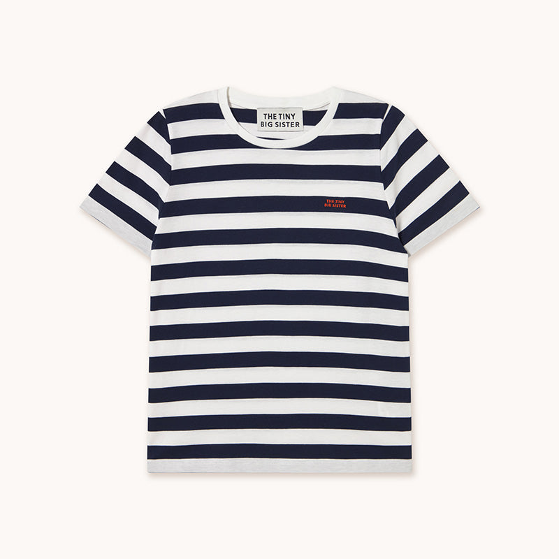 Wardrobe classic: The Tiny Big Sister women's short-sleeved T-shirt in navy blue and off-white yarn-dyed stripes. Made from soft pima cotton, the top has a small red logo.