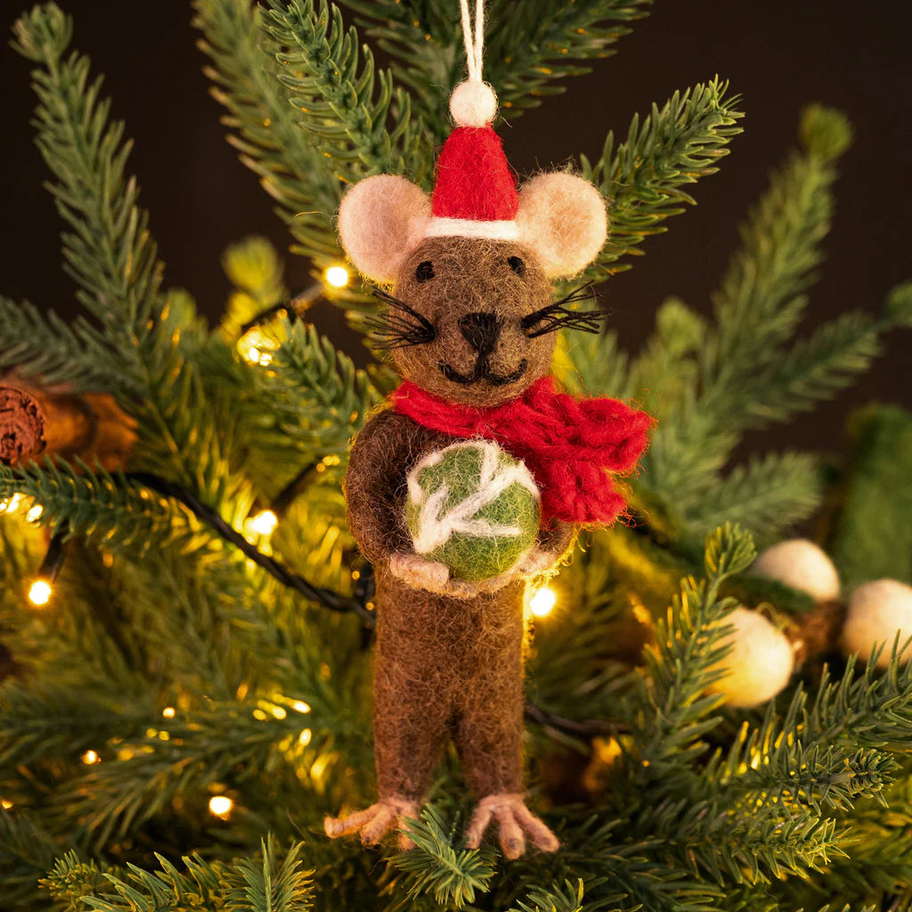 Amica's irresistible festive rat felt decoration is carrying a sprout and wearing a sweet red Christmas hat and red scarf. Handmade in Nepal from wool felt, it comes with a hanging loop. A lovely addition to your Christmas tree or festive decorations.