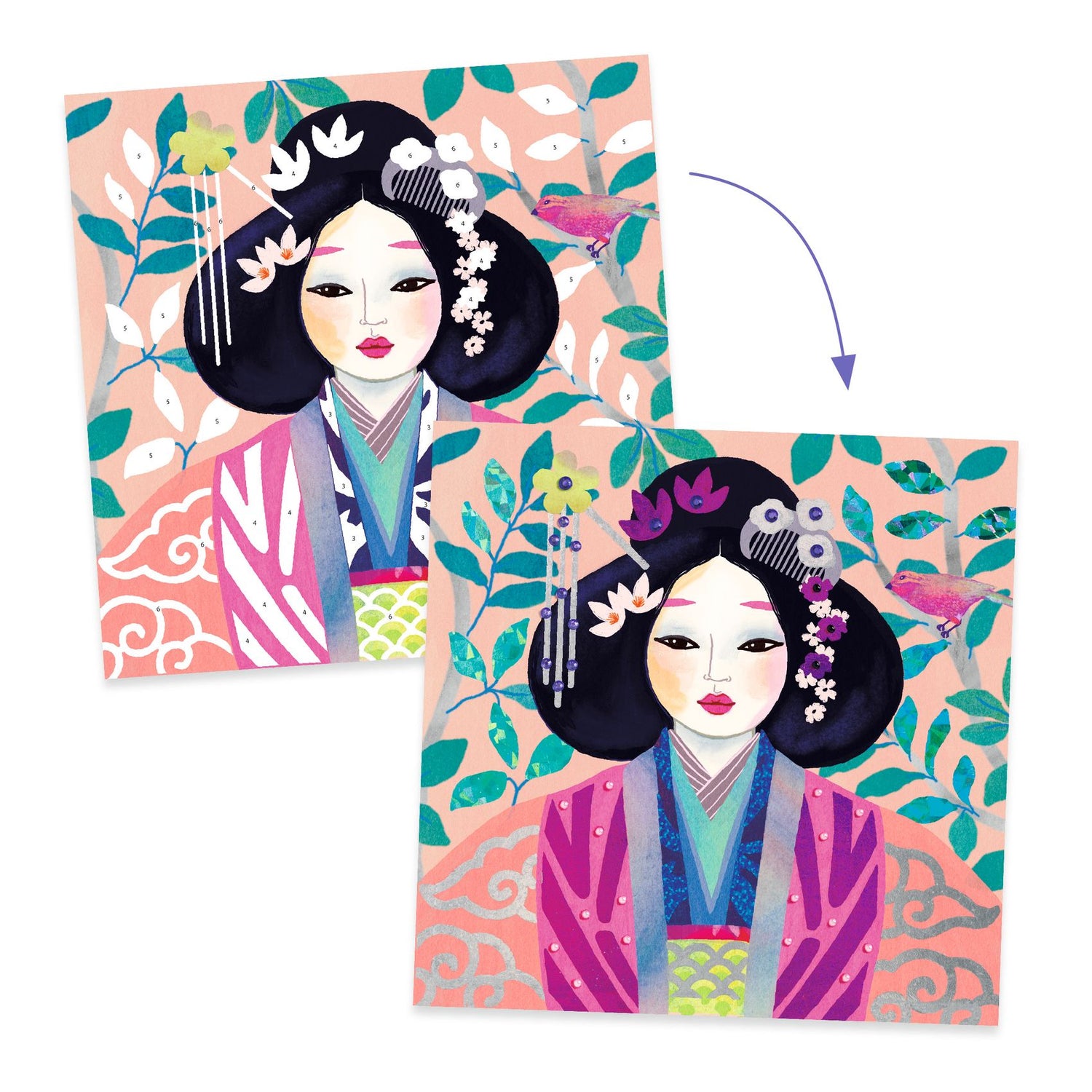 Decorate four fabulous pictures of beautiful strong women with rhinestones and metallic foil with Djeco's craft set. Identify the areas to be foiled using the colour code on the boards, then remove the protective film from the pre-glued surface and apply the foil sheet. The material sticks as if by magic! All that’s left is to stick on the rhinestones to make the pictures shine.
