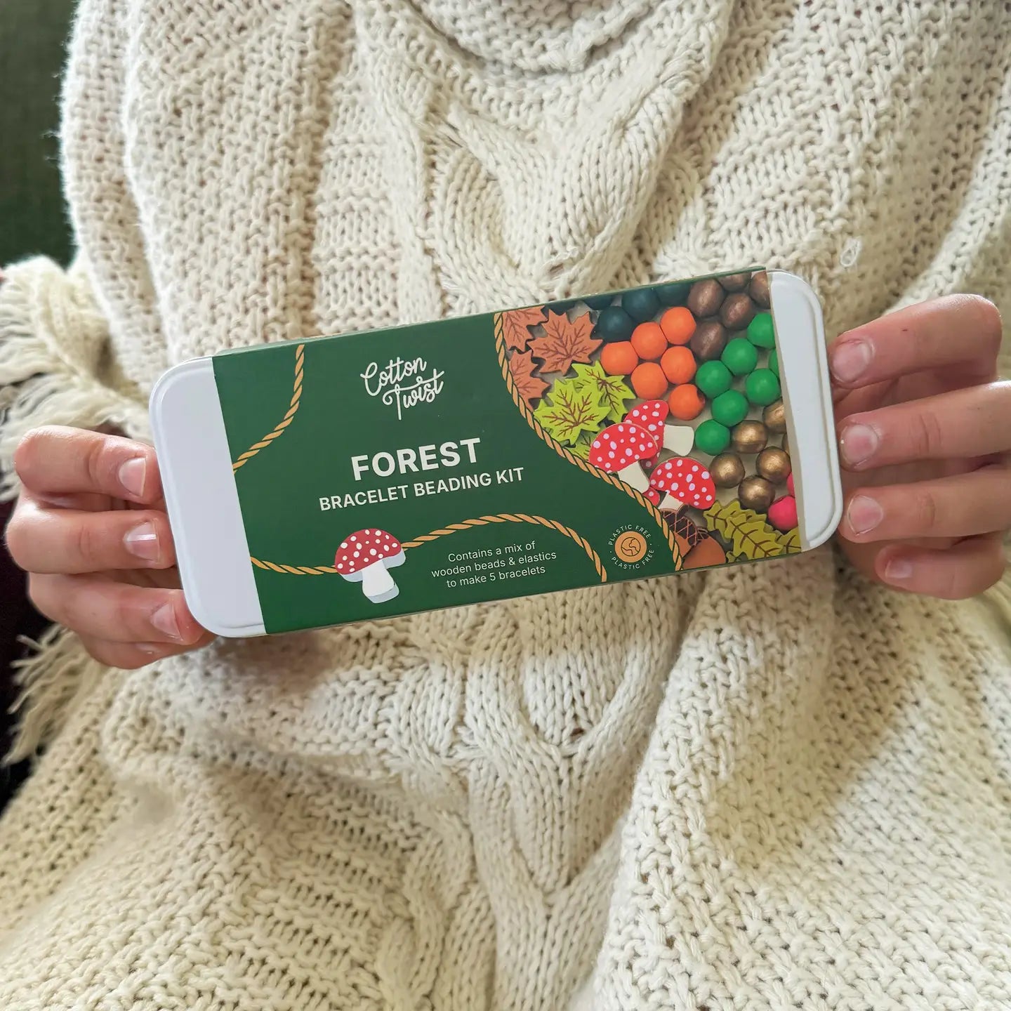 Cotton Twist's lovely bracelet beading tin contains enough wooden beads and elastics to make five gorgeous forest-inspired bracelets. The reusable tin contains six mushroom beads, four acorn beads, 12 oak and maple leaf beads and 60 spherical beads, plus five white elastics with metal ends for easy threading.